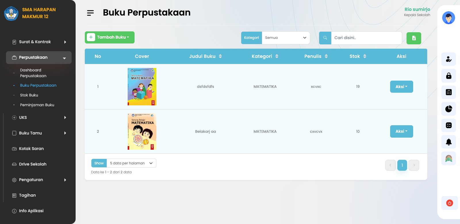 Salah satu fitur utama dari fitur perpustakaan sekolah adalah kemampuannya untuk menyimpan catatan tentang setiap buku yang ada dalam koleksi perpustakaan. Informasi yang tersedia termasuk judul, pengarang, nomor panggil, dan status ketersediaan buku. Hal ini memudahkan staf perpustakaan untuk mengetahui posisi buku tersebut dan memfasilitasi proses peminjaman.